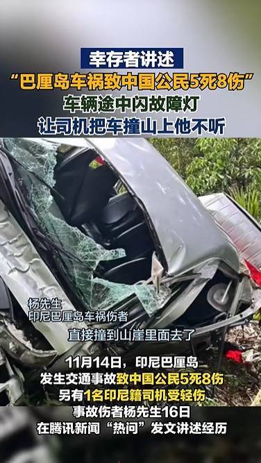 据封面新闻报道:11月17日,当事人杨先生发文称,事发当天凌晨,杨先生一家及其母亲的几位同村人一起,打算去罗威纳海滩追海豚,司机突然叫他看车子的灯,发动机和刹车两个故障灯都亮了,车子处于失控状态。