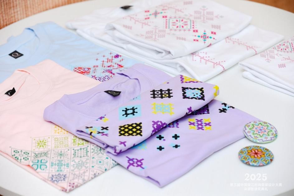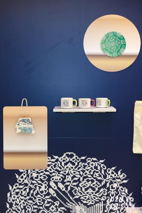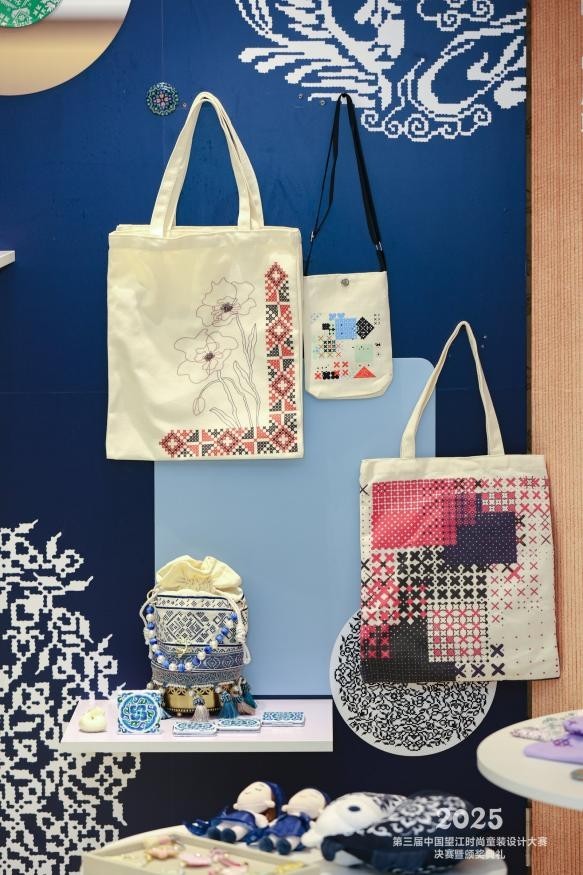在活动现场,“望江挑花”创新应用展示区备受关注。该展区以安徽望江非遗技艺“望江挑花”为主题,重点呈现了鲁美·文化国际服装学院蒋卓君院长与其学生团队的设计创意成果。他们从传统挑花纹样中汲取灵感,通过色彩重构与现代设计语言,将素雅纹样转化为富有青春活力的日常用品。展品涵盖卫衣、帆布袋、手饰、玩偶及各类文创产品,在细节中延续非遗工艺的精致与温度。这一创作实践,不仅让“望江挑花”焕发新生,也推动传统文化以更鲜活、亲切的姿态走进当代生活。