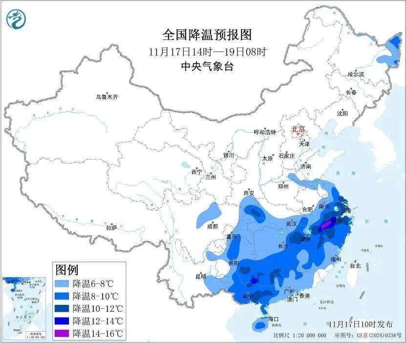 r中央气象台首席预报员陈博宇介绍,本轮寒潮属于秋冬转换时节典型的寒潮天气过程,相较于极端寒潮来说,强度适中。今日(11月17日)寒潮发展至最强,将持续向南推进,影响江汉、江淮以南大部地区,带来大范围大风降温。